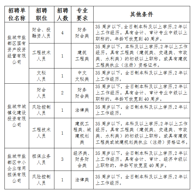 根據(jù)工作需要,鹽城市鹽都區(qū)財(cái)政局直屬國(guó)有企業(yè)鹽城市鹽都區(qū)國(guó)有資產(chǎn)投資經(jīng)營(yíng)有限公司、鹽城市城鎮(zhèn)化建設(shè)投資有限公司、鹽城市鹽都區(qū)中小企業(yè)信用擔(dān)保有限公司決定面向社會(huì)公開招聘工作人員?,F(xiàn)將有關(guān)事項(xiàng)公告如下: