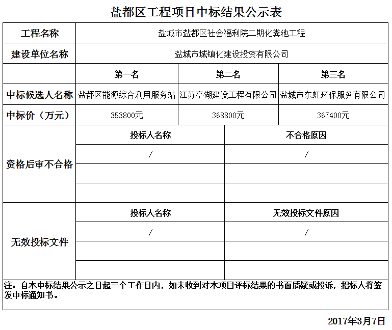 鹽城市鹽都區(qū)社會福利院二期化糞池工程中標結果公示表